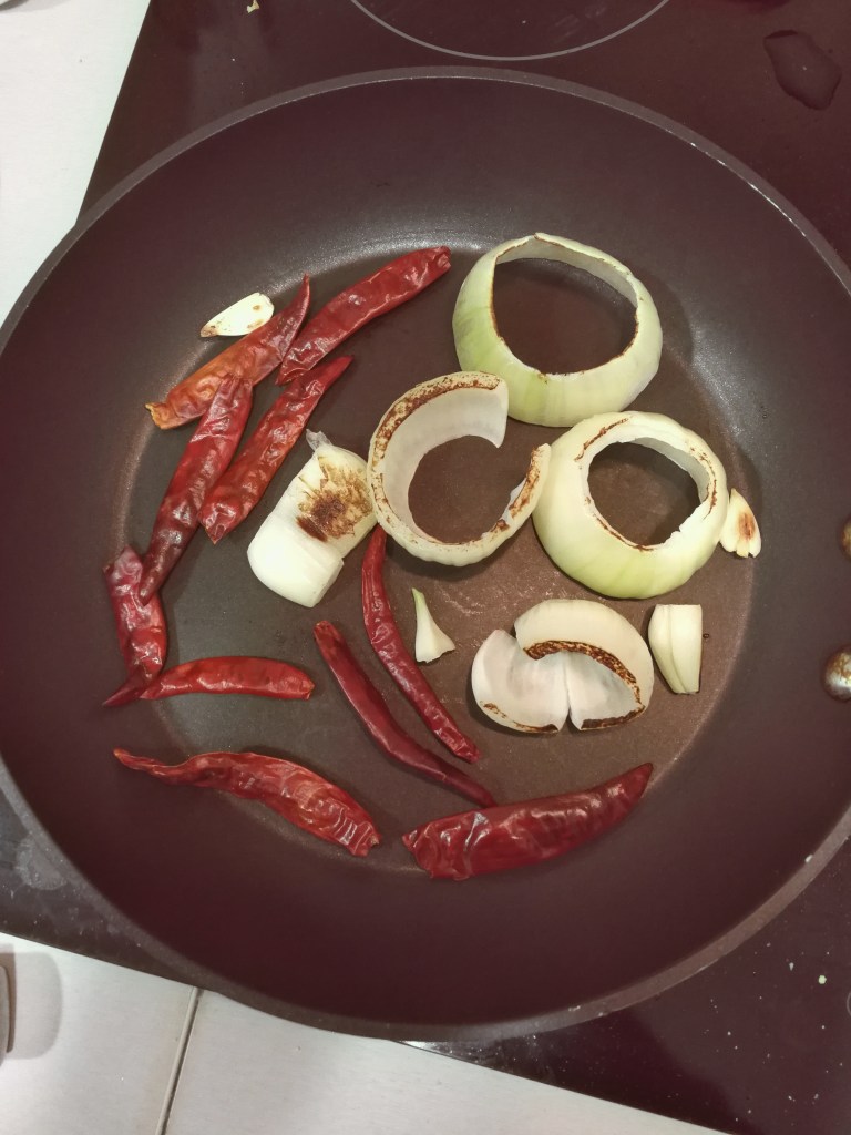 While the chicken is boiling prepare the “salsa verde”. Put the chiles, onion and garlic on a pan and grill over medium heat, chiles are usually done pretty quickly so remove them after a minute or so, it’s important that they don’t get burnt. The onion and the garlic should be left until charred (partially burned).